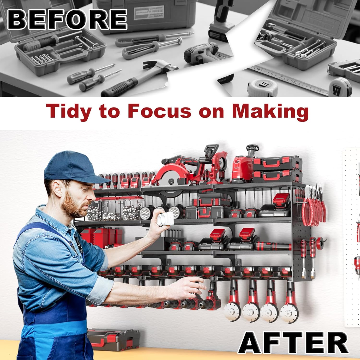 - Massive 12 Drills Rack Storage:This power tool organizer features a 4-tier structure.Store up to 12 Cordless Drills on the bottom tier, with spacious compartments above for large power heavy tools or various small tools,the side features a multi-functional hanging board, offering maximum tool storage capacity for serious DIYers