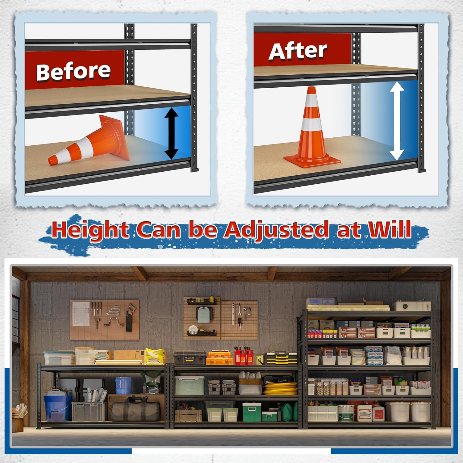 - 【2550LBS Capacity Garage Shelving Heavy Duty】The heavy duty shelving is constructed with reinforced steel legs, featuring a high-grade metal frame paired with 5mm thickened MDF boards. Every shelf of the garage storage shelves, reinforced by 3 support bars, can support up to 510LBS—delivering a total capacity of 2550LBS. The robust load capacity ensures exceptional stability and maximizes storage efficiency