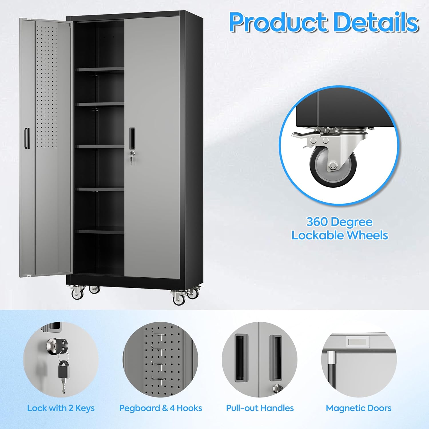 71" H×32" W×16" D Garage Storage Cabinet with Wheels & Pegboard, Locking Metal Storage Cabinet with Doors and 5 Adjustable Shelves & & 4 Hooks for Garage Warehouse Home Office, Black and Gray