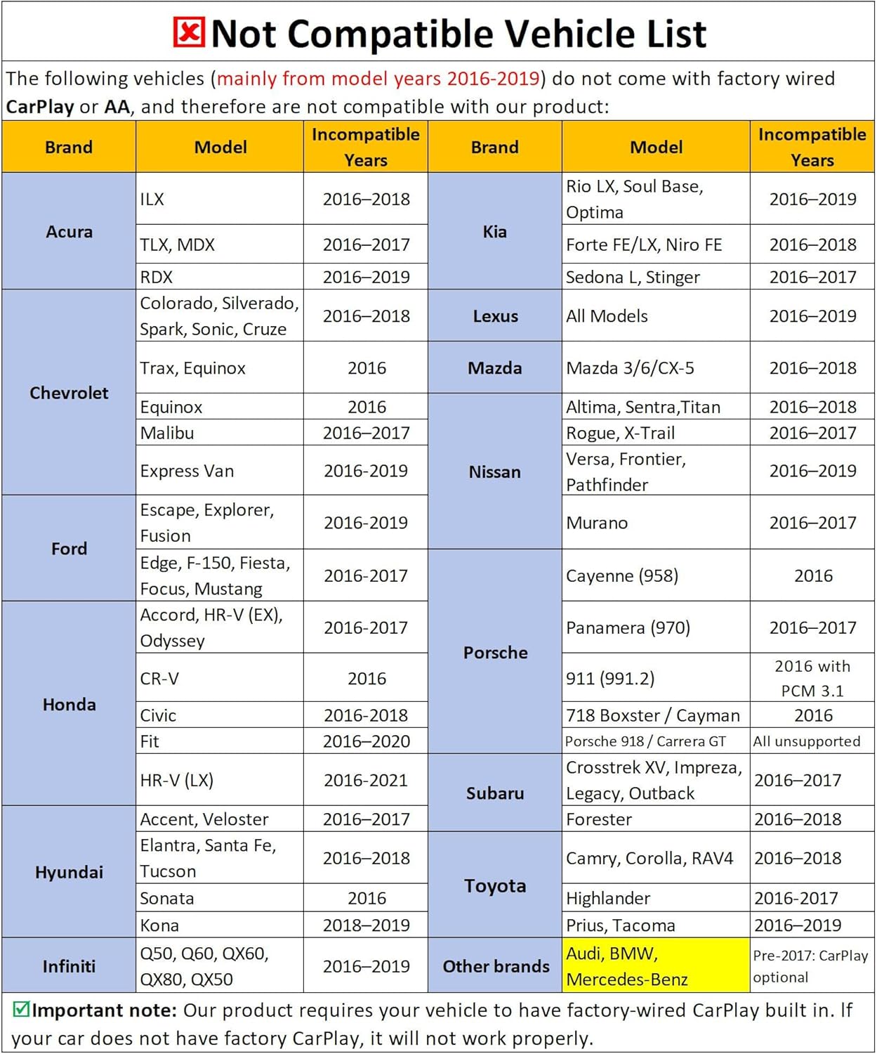 - πΌππππ-πͺππππππ & πΌππππππππππ πͺπππππππππ: This carplay wireless adapter hides in your USB port, freeing up space. Compatible with more than 1000+ car modelsβno brand-specific terms needed. πππππππππ: Only compatible with cars that have original factory wired CarPlay & Android Auto, typically 2016+ for most brands, and 2020+ for some models from T-oyota, L-exus, I-nfiniti, etc.!!!