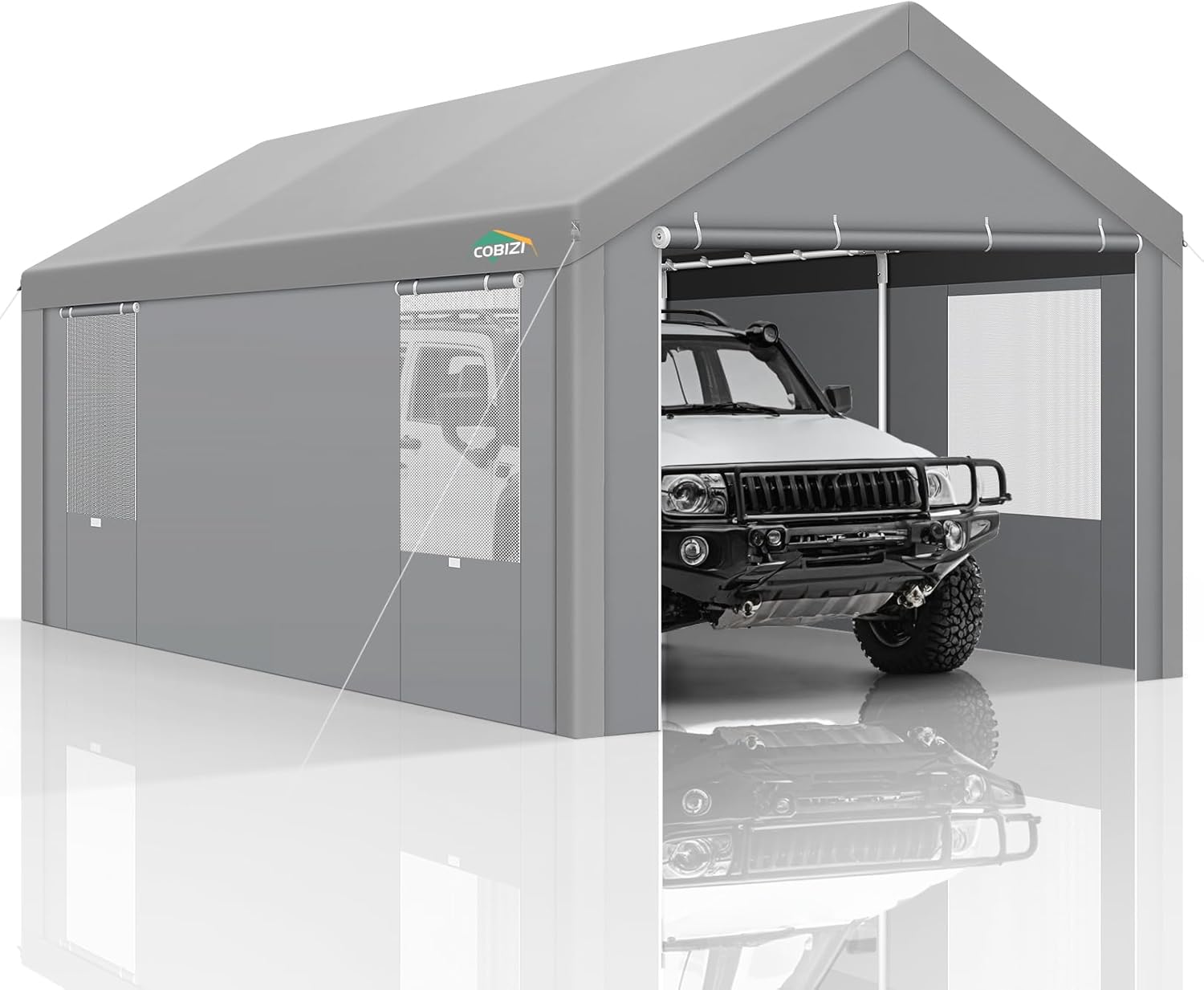 COBIZI Carports 10x20 Heavy Duty Car Canopy Garage with Removable Sidewalls & Doors, Galvanized Frame Portable Carport Canopy with Built-in Sandbags & All-Season Tarp for Car Boat Truck, Gray