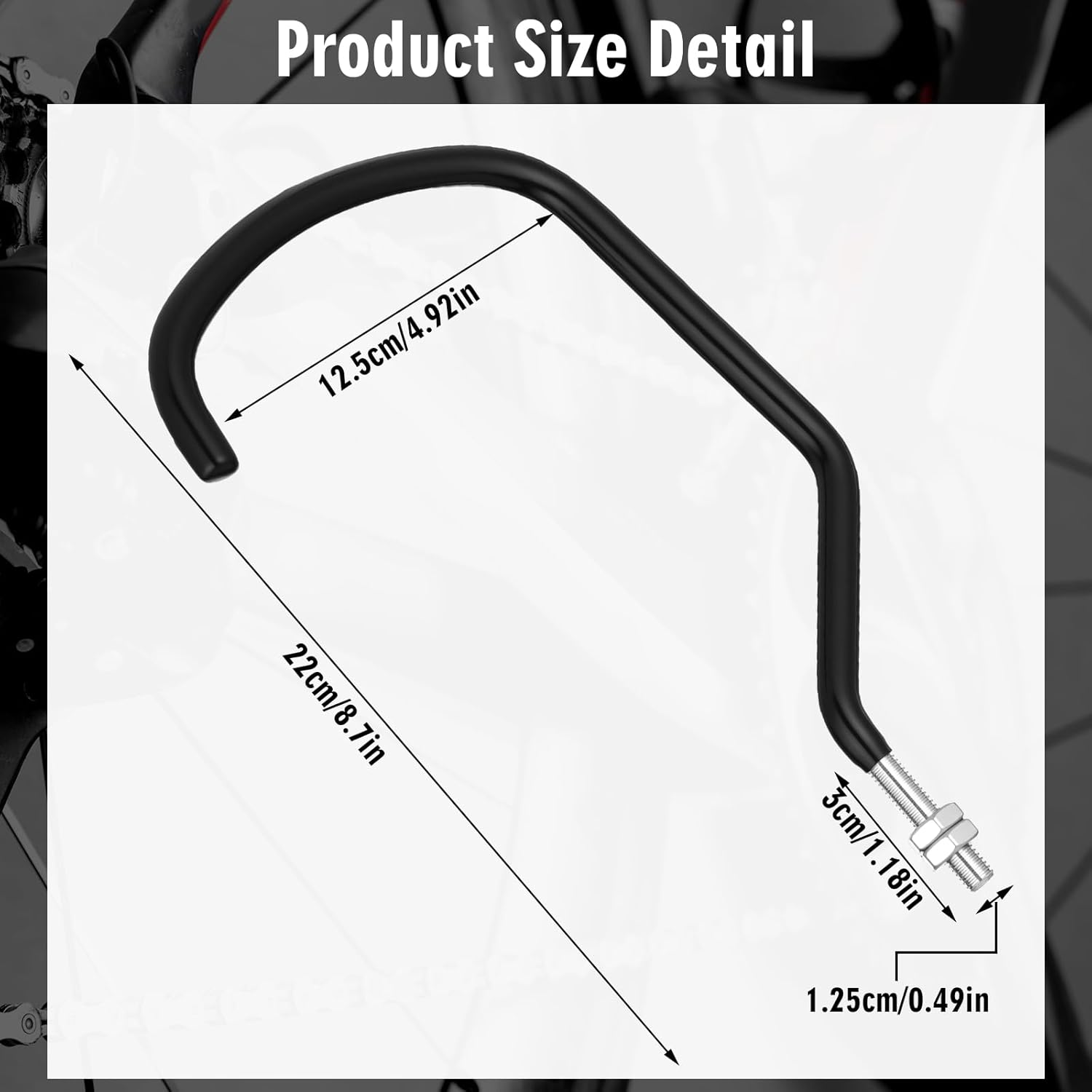 - Built to Last: crafted from robust 9 mm steel rod, these 8 pack bike hooks offer unmatched strength and durability; The inner width of the bend is about 4.92 inches; Designed to support bicycles of various sizes and weights, they're ideal for both home garages and commercial storage