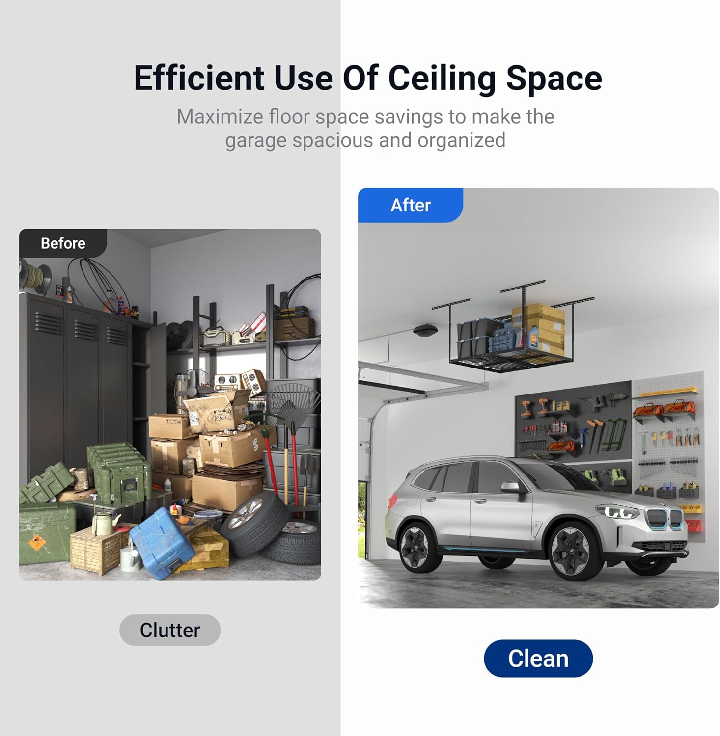- Free Up Floor Space: Avoid water damage by storing your items off the garage floor and utilize the garage ceiling space to protect and store seasonal and unused items. Unlike traditional floor storage bins, this ceiling rack features a grid design that allows for easy access to your belongings. The adjustable ceiling dropdown ranges from 22" to 40", providing up to 42 cu. ft. of storage. Dimensions: 48 in. L x 36 in. W x 22-40 in. H. (Hooks sold separately)