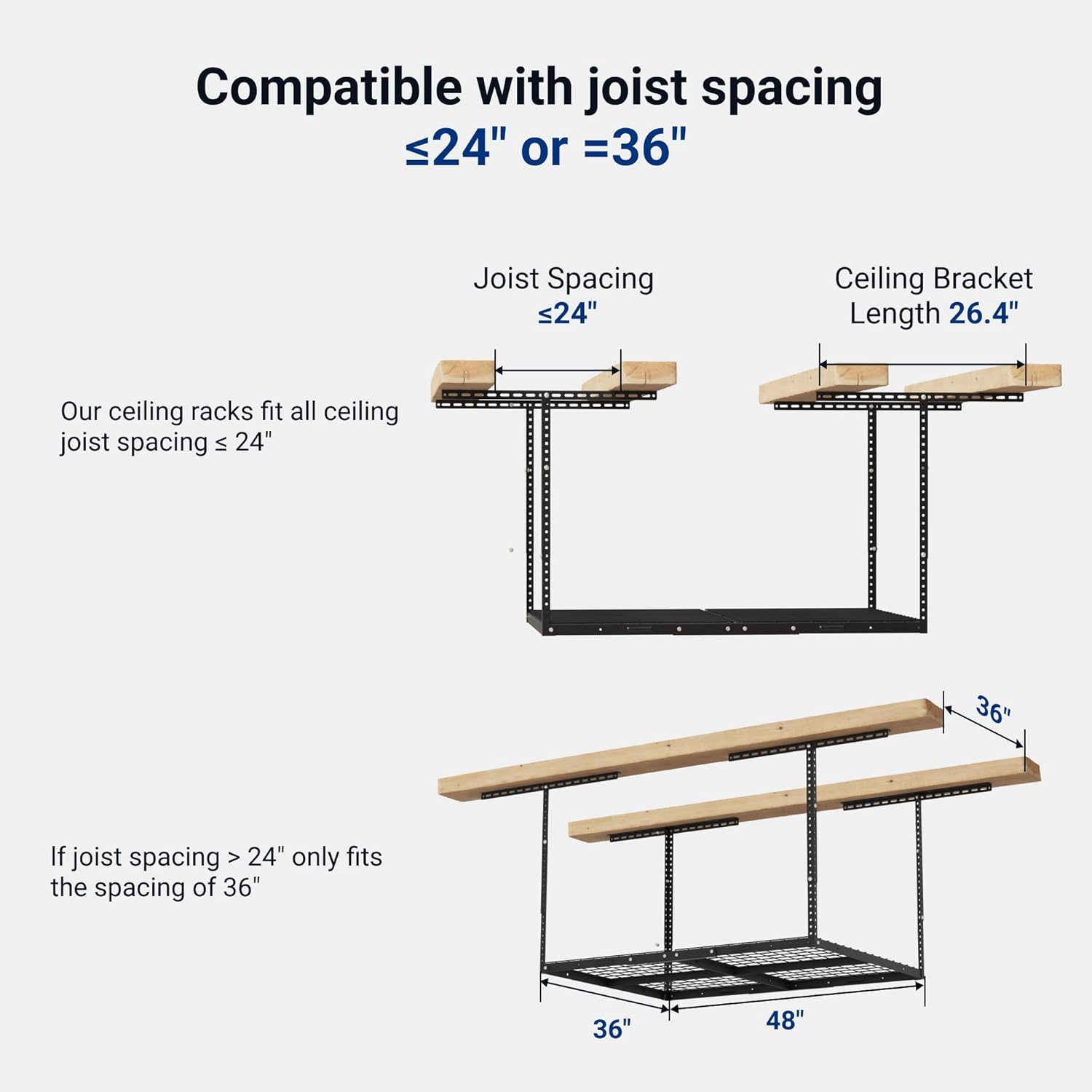 - DIY Installation: More suitable for customizable combinations and installation in small spaces. The installation template helps with planning. This overhead storage rack fits all ceiling joist spacing of 24 inches or less. If the joist spacing is greater than 24 inches, it only fits ceiling spacing of 36 inches.