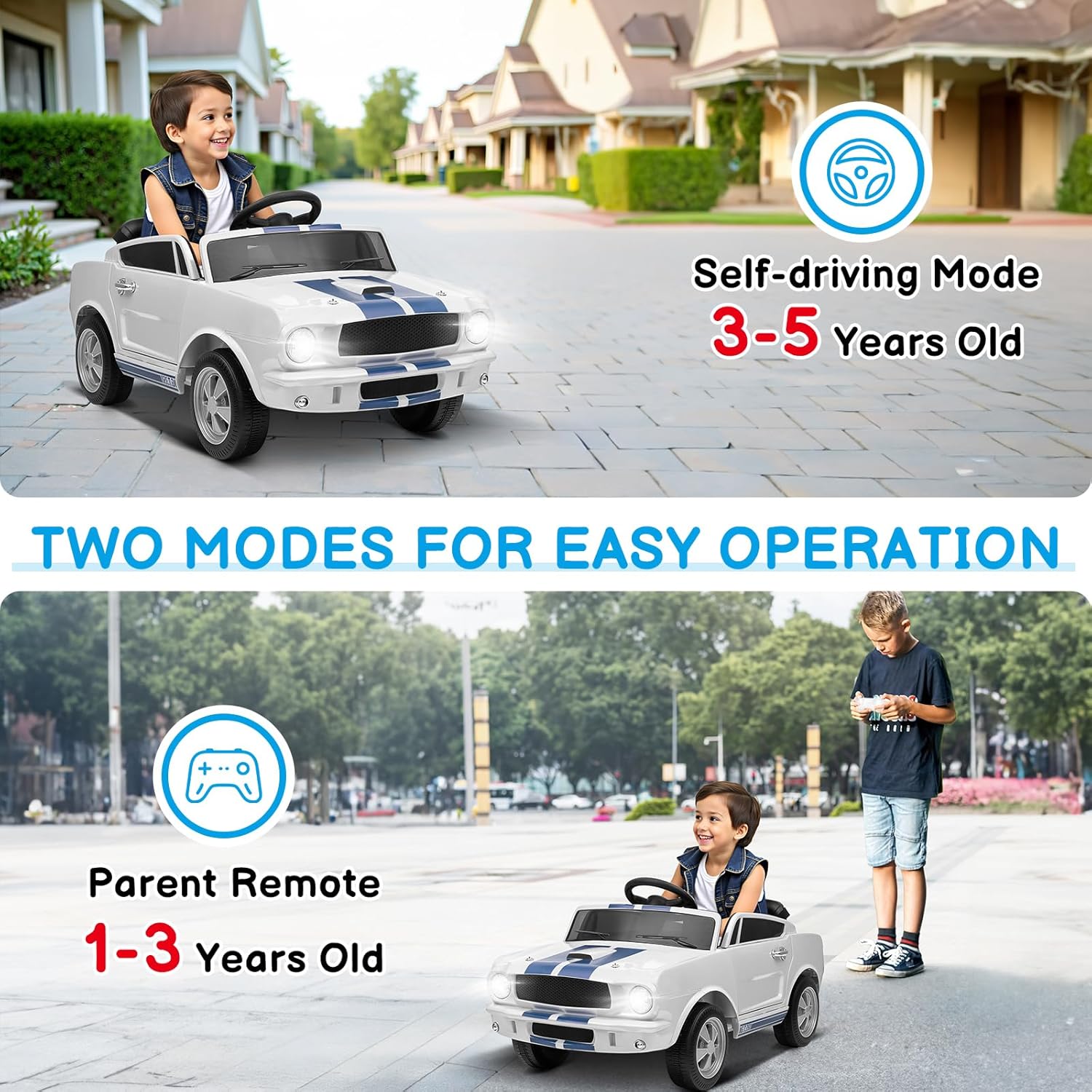 Winado Licensed Shelby Electric Car for Kids, Battery Powered Ride On Toy for Toddlers with Remote Control, Upgrade Display Panel, Bluetooth, Shock Absorbers, Safety Belt, 3 Speeds, LED Lights - White