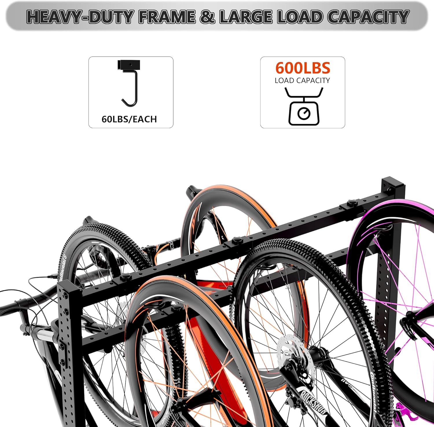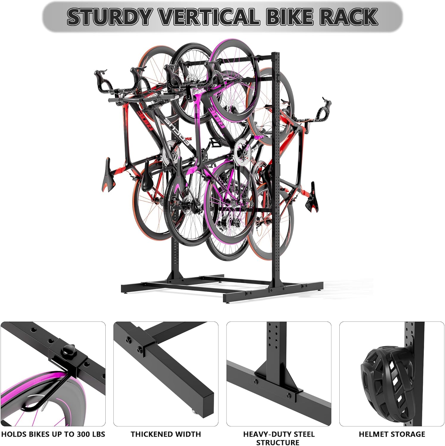 - ☪【Freestanding Bike Rack】: Single-sided can hang up to 5 bikes vertically; double-sided can hang up to 8, and 6 is recommended to be the most suitable. Save storage space without wall hanging. This rack can accommodate all types of bicycles, including road bikes, mountain bikes, children's bikes, electric bikes, etc. The floor-standing design makes it easy for you to move it in the garage or shed as needed.