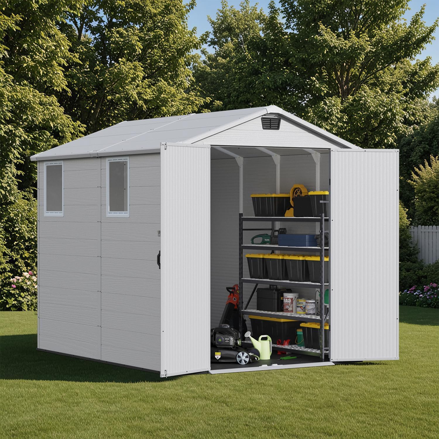 Patiowell 6x8 FT Outdoor Storage Shed with Floor - Resin Tool Shed with Lockable Door & 2 Windows, Easy Assembly for Garden, Backyard, Lawn Equipment, Light Gray