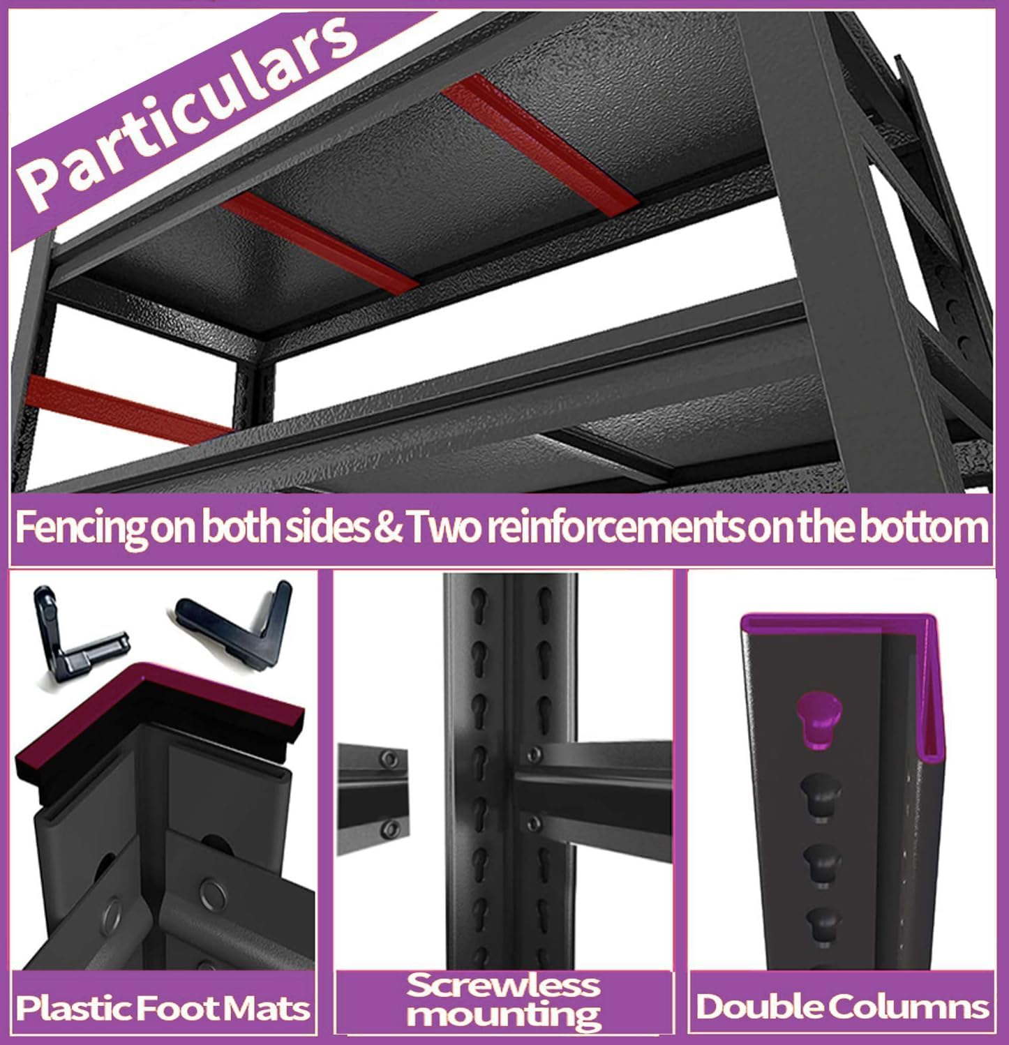 - 【Quick installation of a set of garage storage shelves in 10 minutes】This metal storage shelf adopts an interlocking design, which does not require any bolts or nuts for installation. It does not even require any installation tools. A set of 5-Tier metal shelves can be installed by hand in 10 minutes.