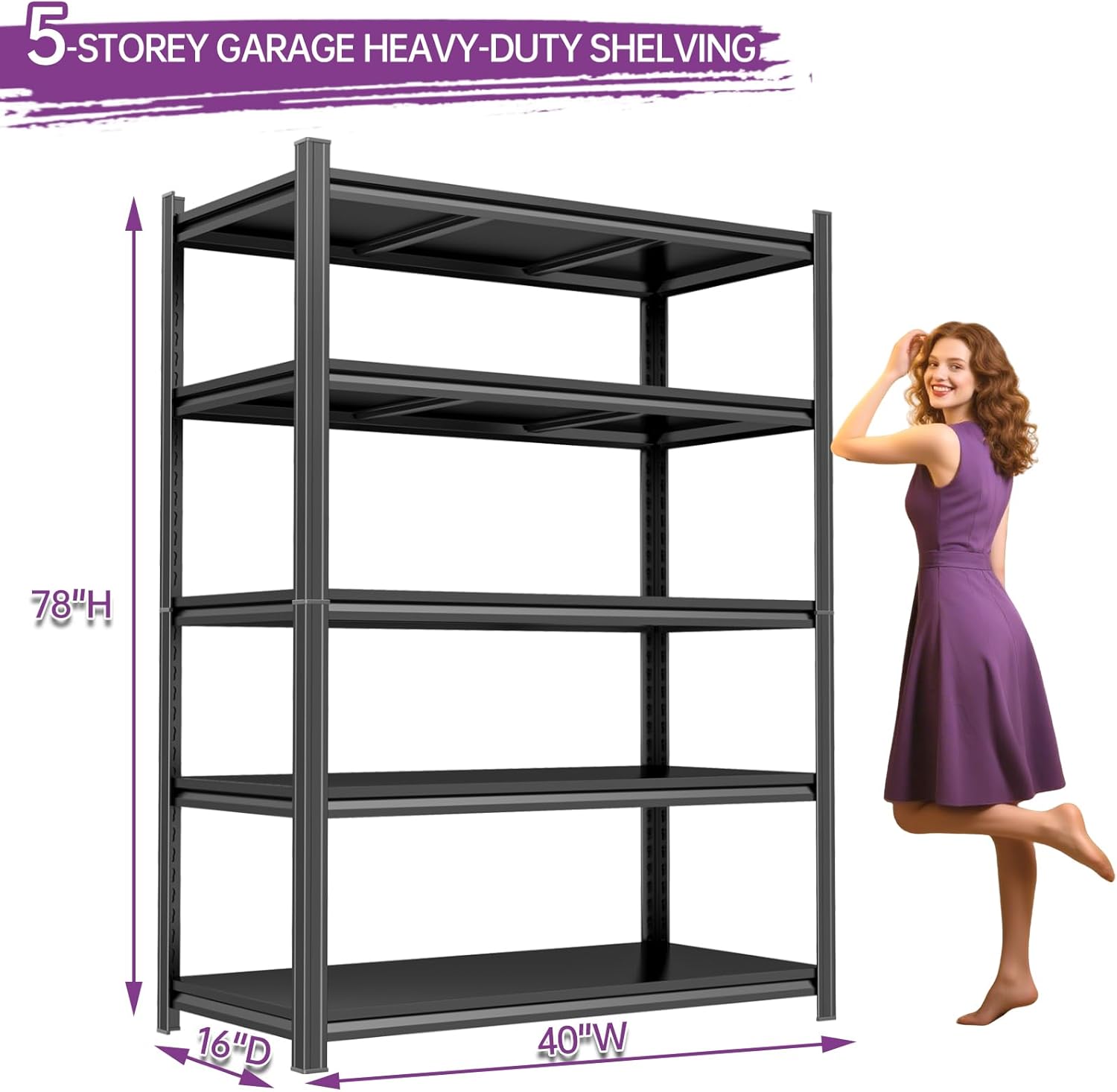 - 【78“H×40”W×16“D for multiple applications】This garage storage shelves is the perfect size for garages, storage rooms, warehouses, basements, offices, supermarkets, commercial institutions, schools, and libraries. Its 5-tier 78”H metal structure maximizes your storage capacity, providing efficient organization for a variety of items and helping to keep your home or workplace neat and tidy.
