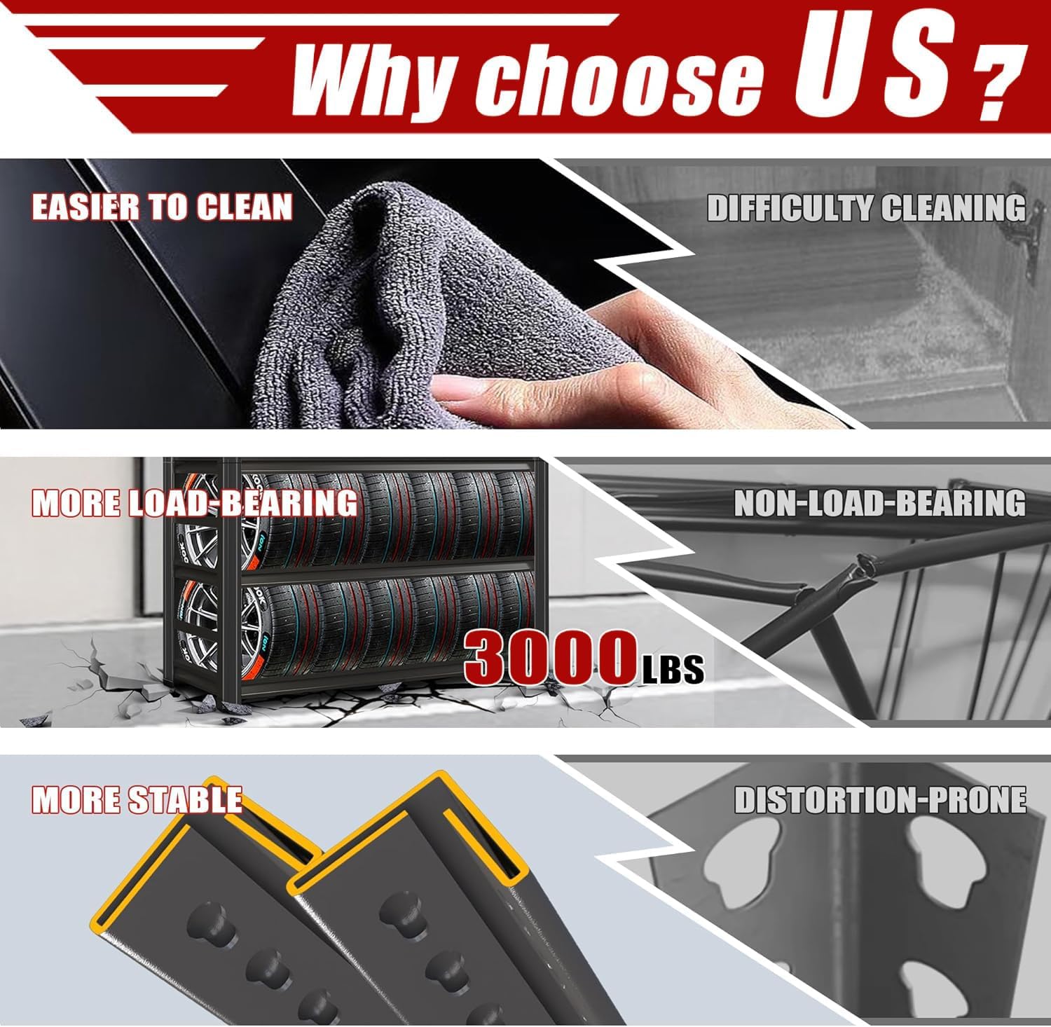- 【Heavy-Duty Steel Construction】Built with durable cold-rolled steel, this garage shelving unit features thickened uprights and cross beams for reliable stability. The scientific frame design of this metal shelving evenly distributes weight, minimizing concerns about shifting or bending—making it more sturdy than common plastic or wooden storage shelves. With a 3800-lb capacity, this metal shelving system is a practical solution for garage storage needs, pairing well with other garage shelves for organized space