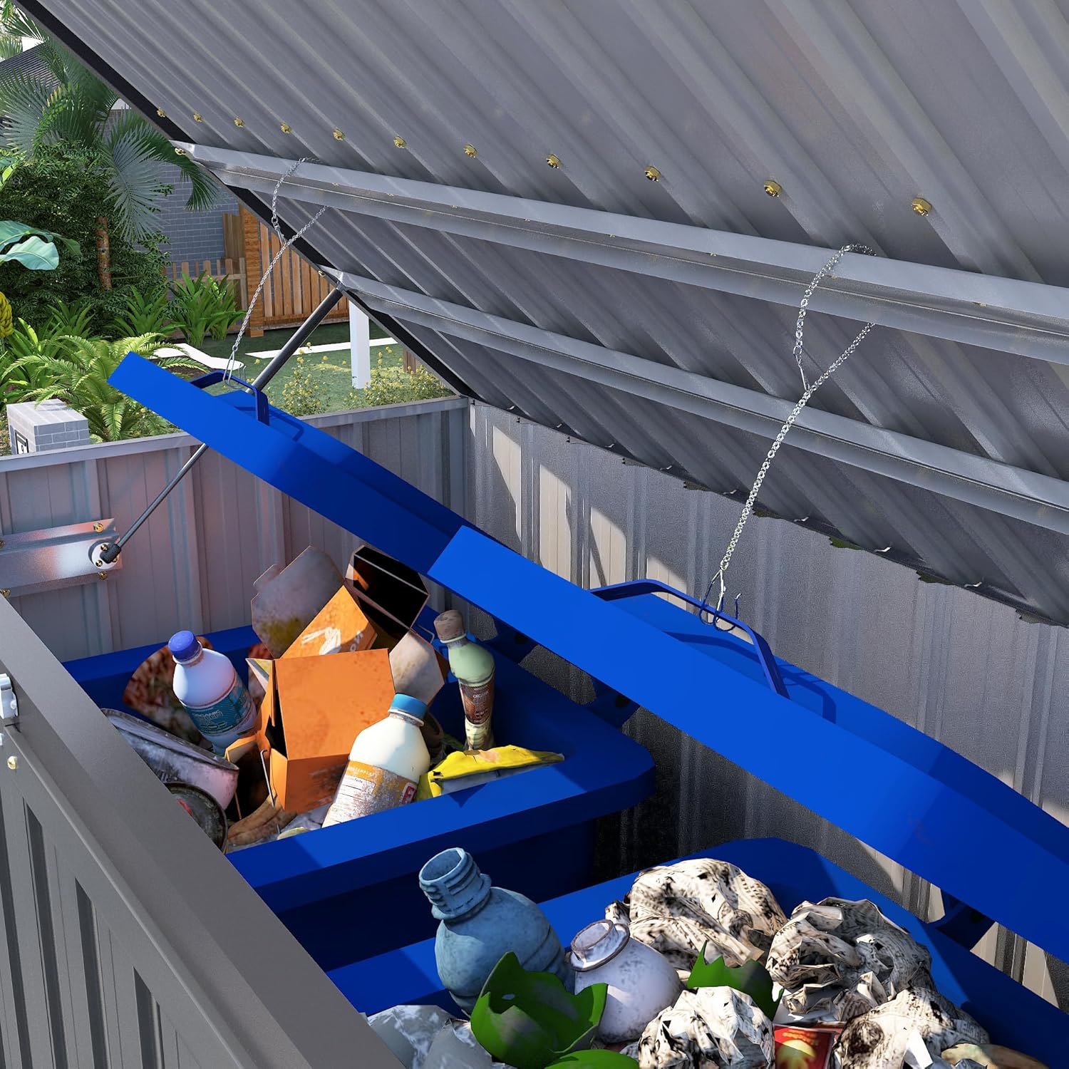 - Portability and Security: When used as an outdoor trash can storage, the design includes independent, upward-opening lid hooks that attach directly to the garbage can lid. A hydraulic mechanism ensures smooth opening and closing. Lockable double doors extend to 47 inches, allowing for the storage of longer items like bicycles and enhancing security, making it a versatile solution for both bike storage and outdoor storage.