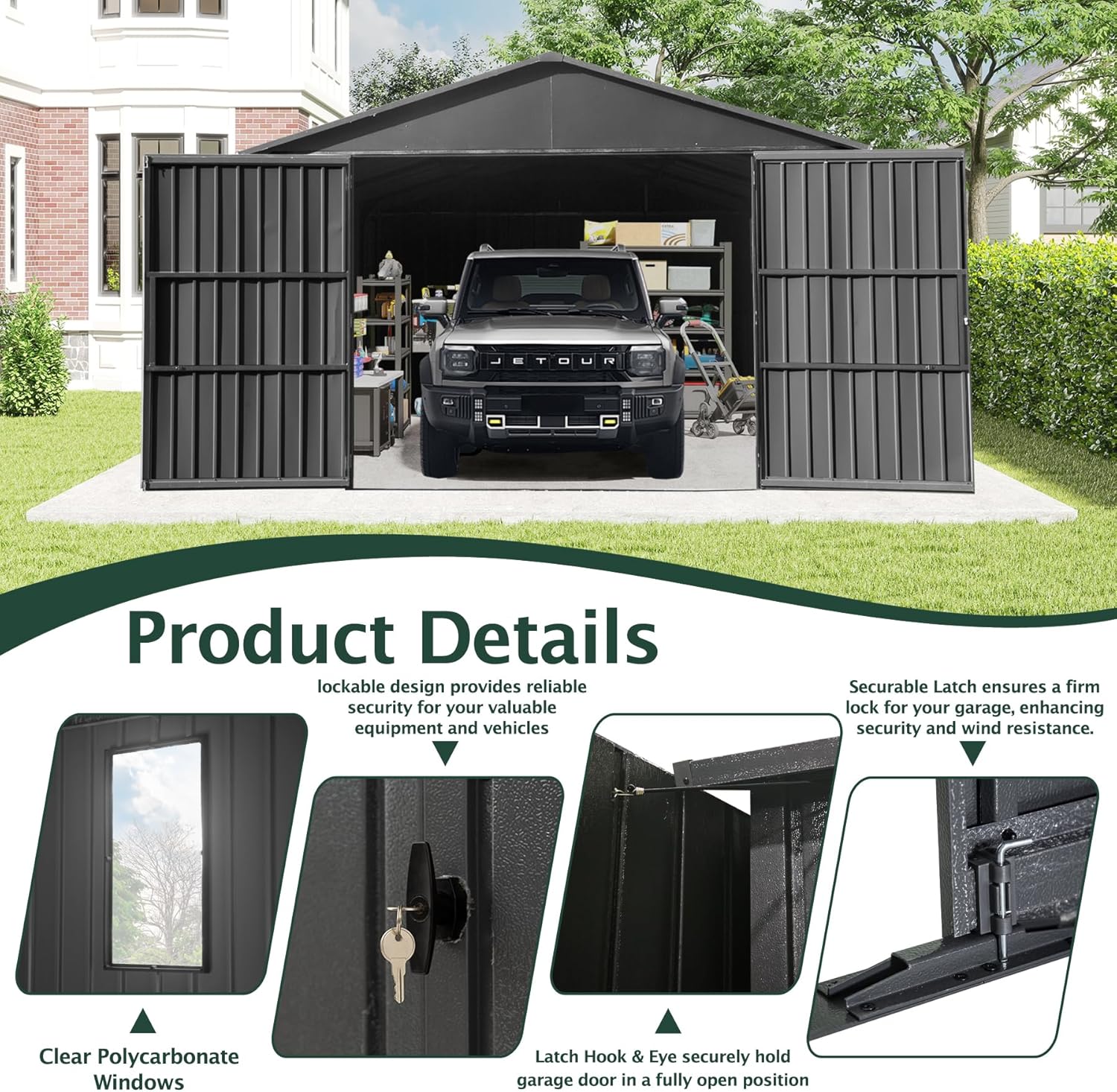 - Smart Dual-Door Access System - The extra-wide 95.3"x78.6" double doors easily accommodate pickup trucks and SUVs, while the convenient side door ensures you're never trapped inside. The included latch hook securely holds doors fully open during vehicle access, and the lockable design provides reliable security for your valuable equipment and vehicles.