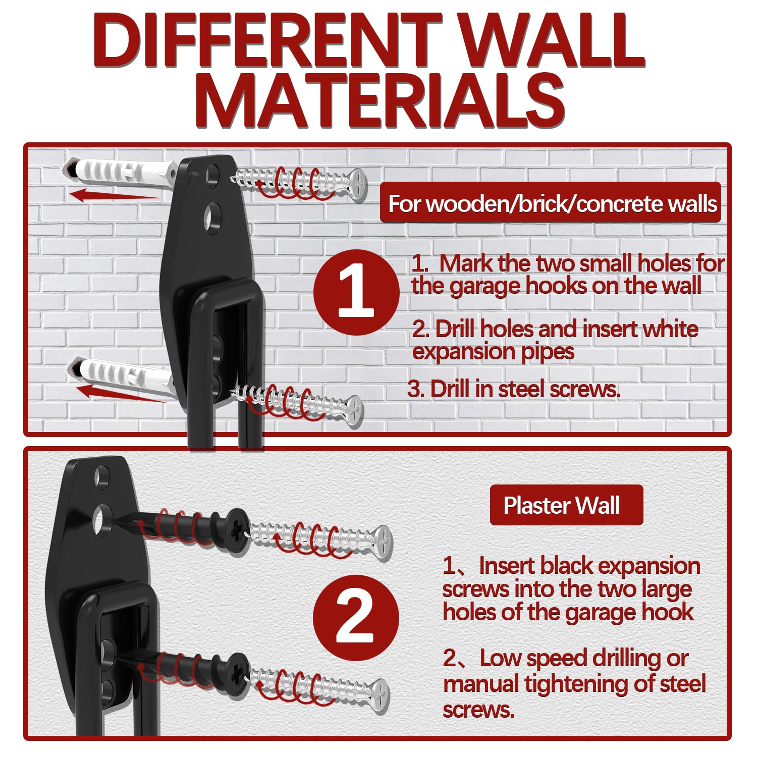 - Easy To Install: These garage hanging hooks are suitable for various walls. You can install them effortlessly. For plaster walls: (1) Insert black expansion screws into the 2 large holes of the heavy duty garage hooks; (2) Low speed drilling or manual tightening of steel screws. For wooden/brick/concrete walls: (1) Mark the 2 small holes for the garage hangers on the wall; (2) Drill holes and insert white expansion pipes; (3) Drill in steel screws