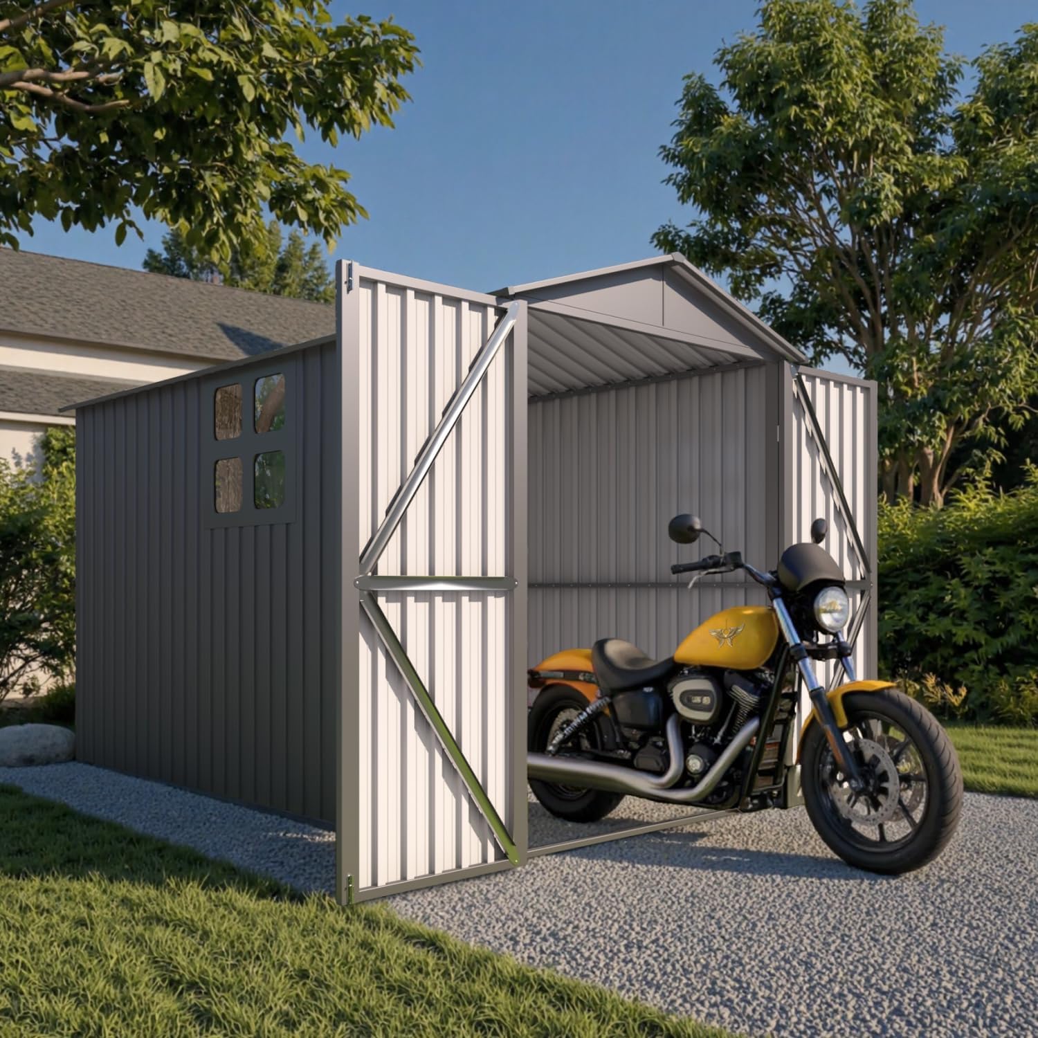 - [Multi-Use Flexibility] Customize your motorcycle storage shed with optional glide tracks for effortless parking, or go track-free for flexible layouts. Beyond bikes, this top-tier Heavy duty vehicle shed transforms into a premium storage hub for tools, gardening gear, pool equipment, and more. One shed, endless possibilities