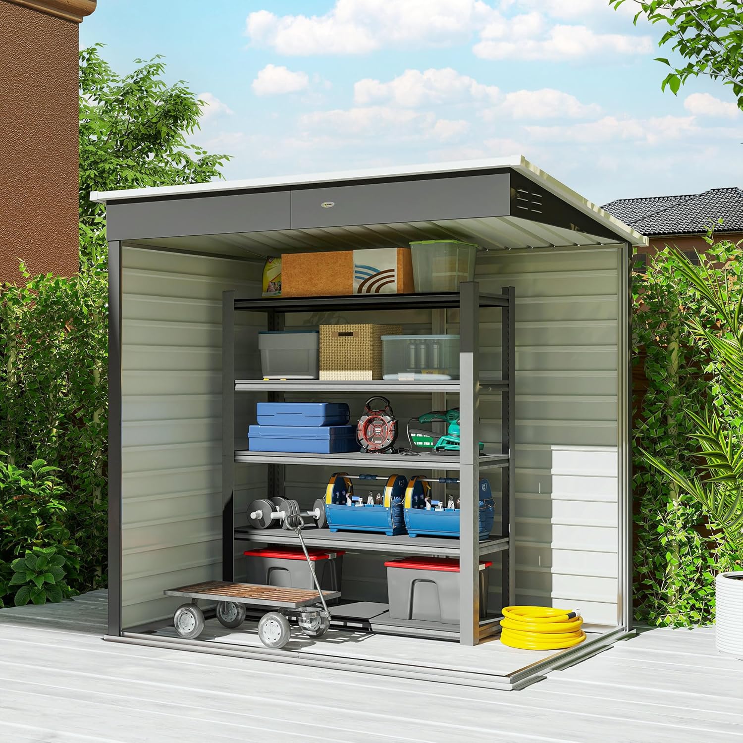 - Compact for small gardens: This 6 x 4 ft metal shed is spacious enough to hold a lawn mower, bike, or long-handled rakes and shovels, it makes organizing easy and your outdoor space clutter-free.