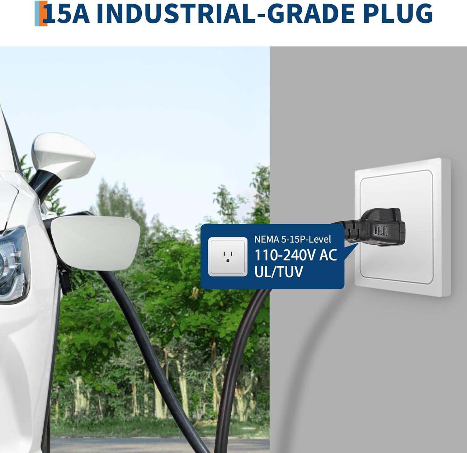 - Dual-Level Fast Charging- The ev charger level 1 supports Level 1 (110V/NEMA 5-15) charging. Delivers 15A output for 40% faster charging (40 miles in 4 hours) compared to standard 10A chargers. Industrial-grade plug ensures stable high-power performance.