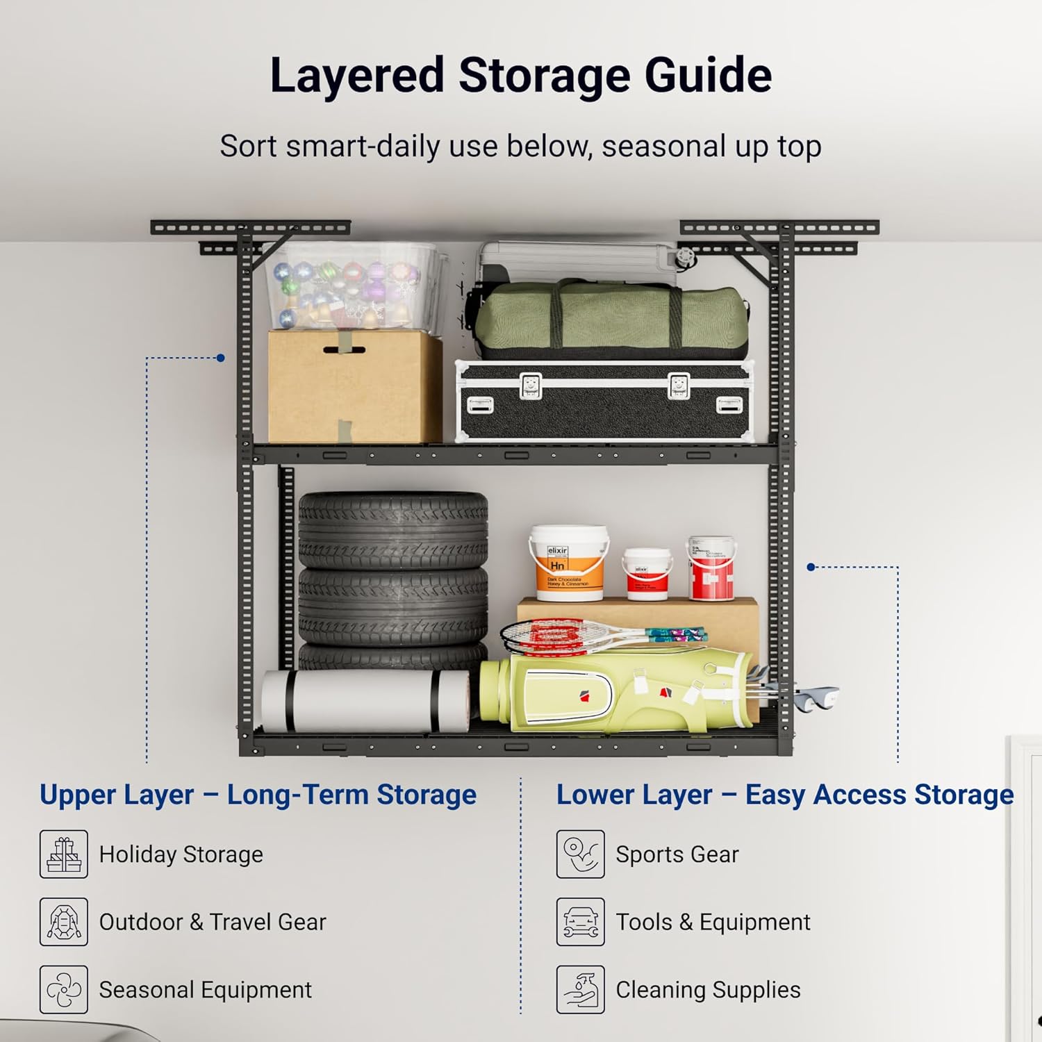 - Maximize Vertical Storage for Tall Garages – The FLEXIMOUNTS 3x6 Double Layer Overhead Garage Storage Rack creates twice the capacity of standard racks, turning unused ceiling space into a clutter free, organized area. Perfect for garage organization in 10–15 ft tall garages. For optimal clearance when parking or walking underneath, double-tier racks are not recommended for garages under 10 ft.