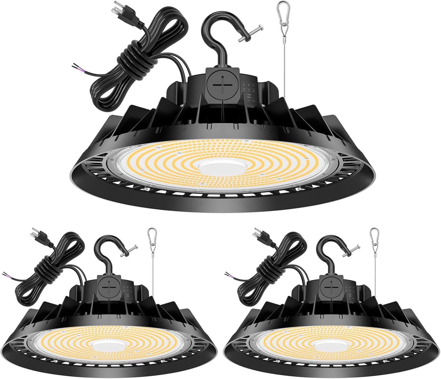 3Pack LED High Bay Lights, 200W UFO High Bay LED Shop Lights, 30000LM Adjustable CCT(5700K 5000K 4500K) & Power(200W 150W 100W), 0-10V Dimmable, 5' Cable Plug, IP65 Waterproof, ETL & DLC Listed