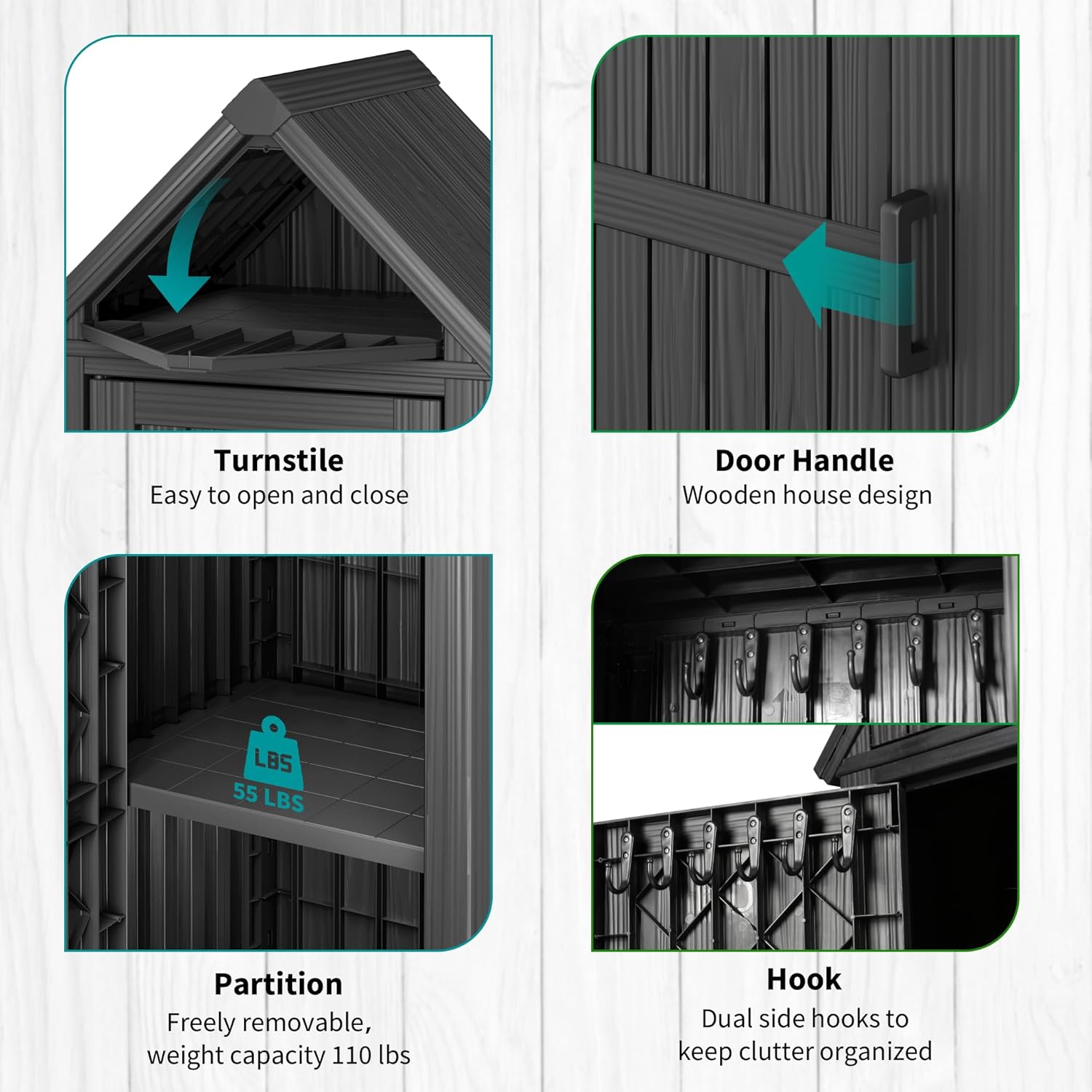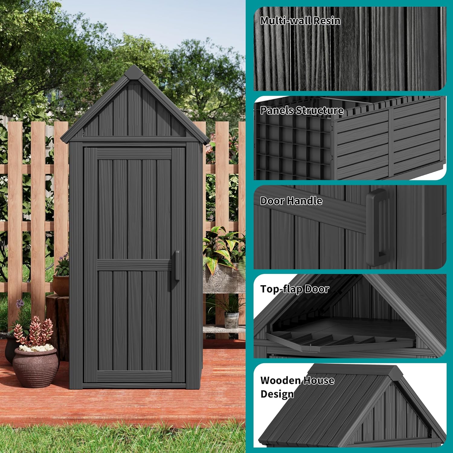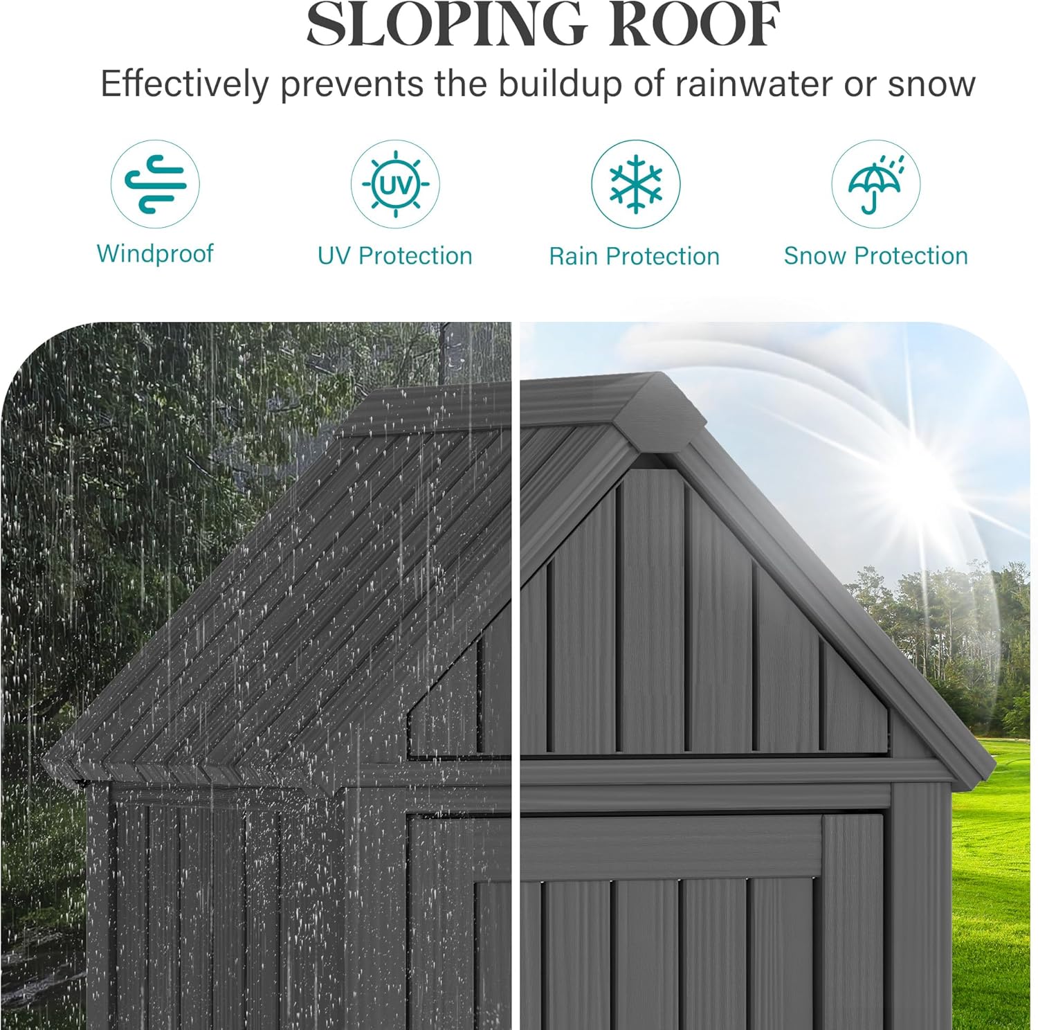 - Durable Material and Stable Structure: This shed is made from durable resin, It's engineered to resist water, UV rays, fading, rust, peeling, and warping, ensuring minimal maintenance for years.