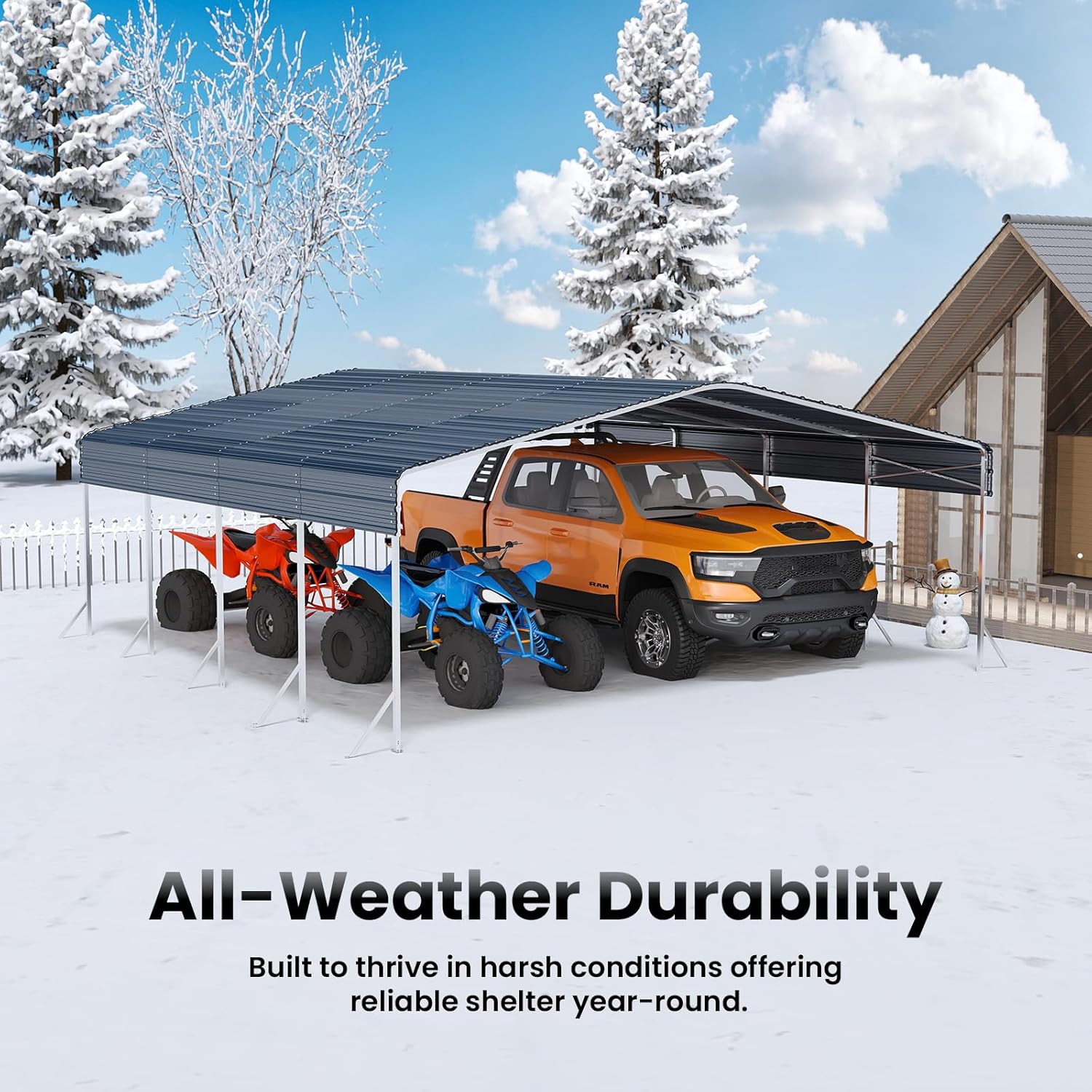 - Year-Round Protection – The 2" x 2" reinforced frame and 27-gauge metal roof provide reliable shelter, keeping your vehicles and equipment safe from rain, snow, wind, and sun