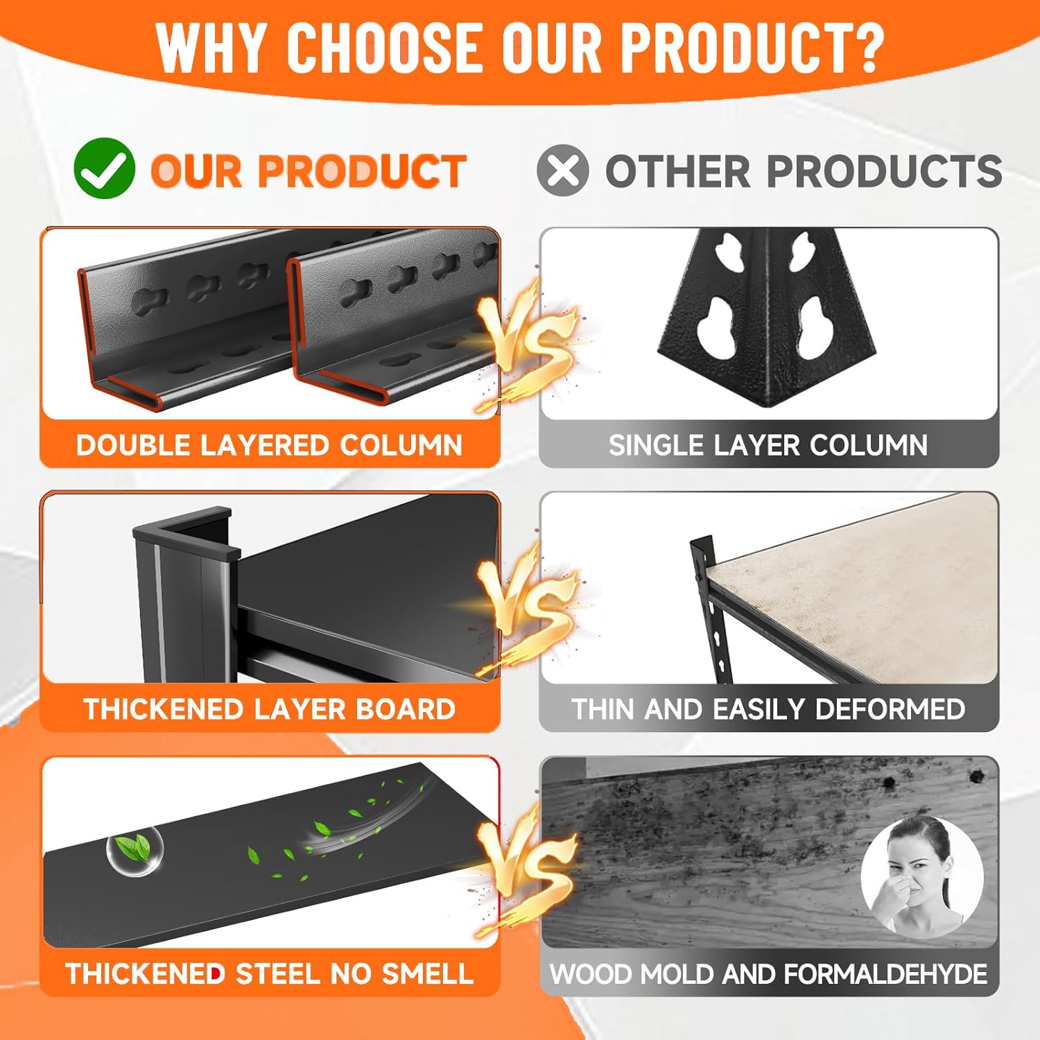 - 【Garage Shelving Heavy Duty Load 3500LBS 】 This storage shelves features double-layer reinforced uprights with support ribs on each shelf level. Constructed from a high-quality steel frame and durable steel decking, each shelf supports up to 700 LBS, delivering a total capacity of 3500 LBS. This robust 5-tier shelving unit offers exceptional stability and strength, allowing you to store more items securely.