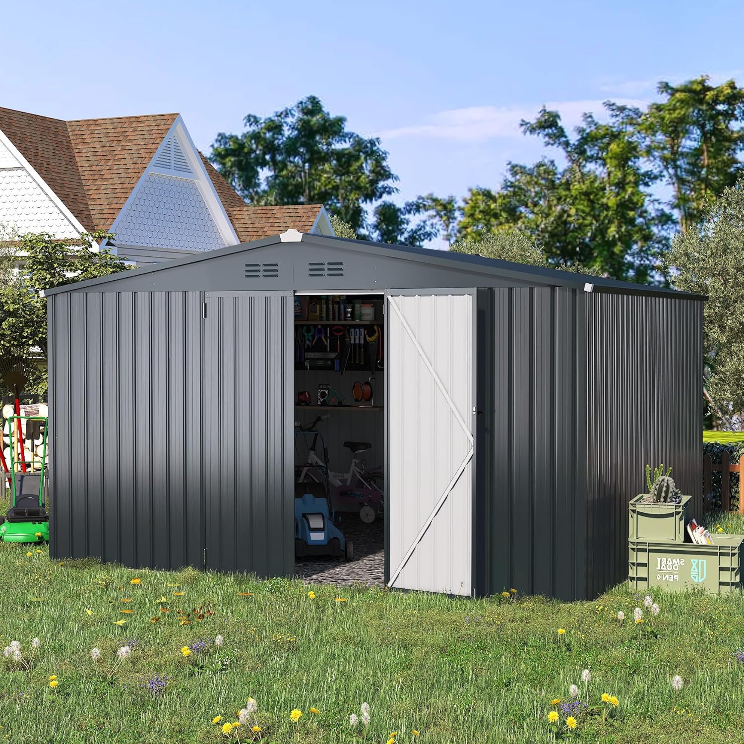 AECOJOY 12' x 10' Outdoor Storage Shed, Dark Grey Large 10x12 Sheds & Outdoor Storage Clearance with Lockable Doors, Utility and Tool Storage Garden Shed Backyard, Patio and Outside use
