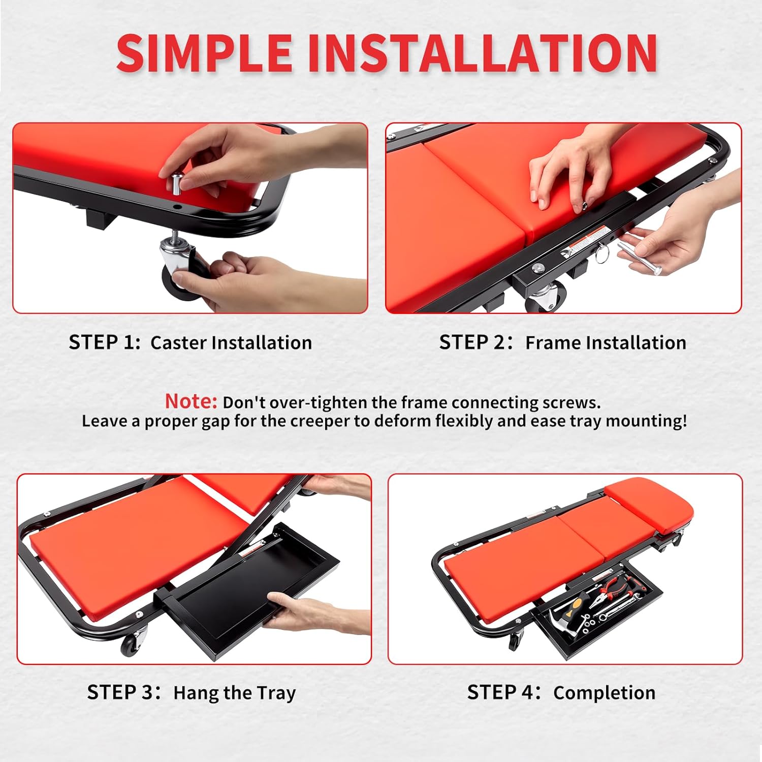 - 2-in-1 Modes - Easily switch between sitting and lying modes with a simple pull of the pin, accommodating different work needs. The tool tray keeps your tools within easy reach.