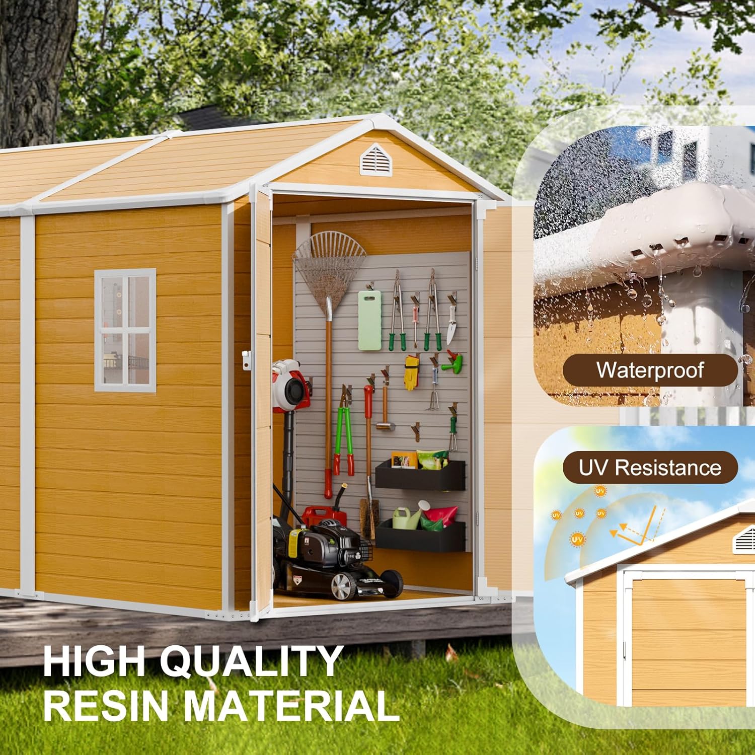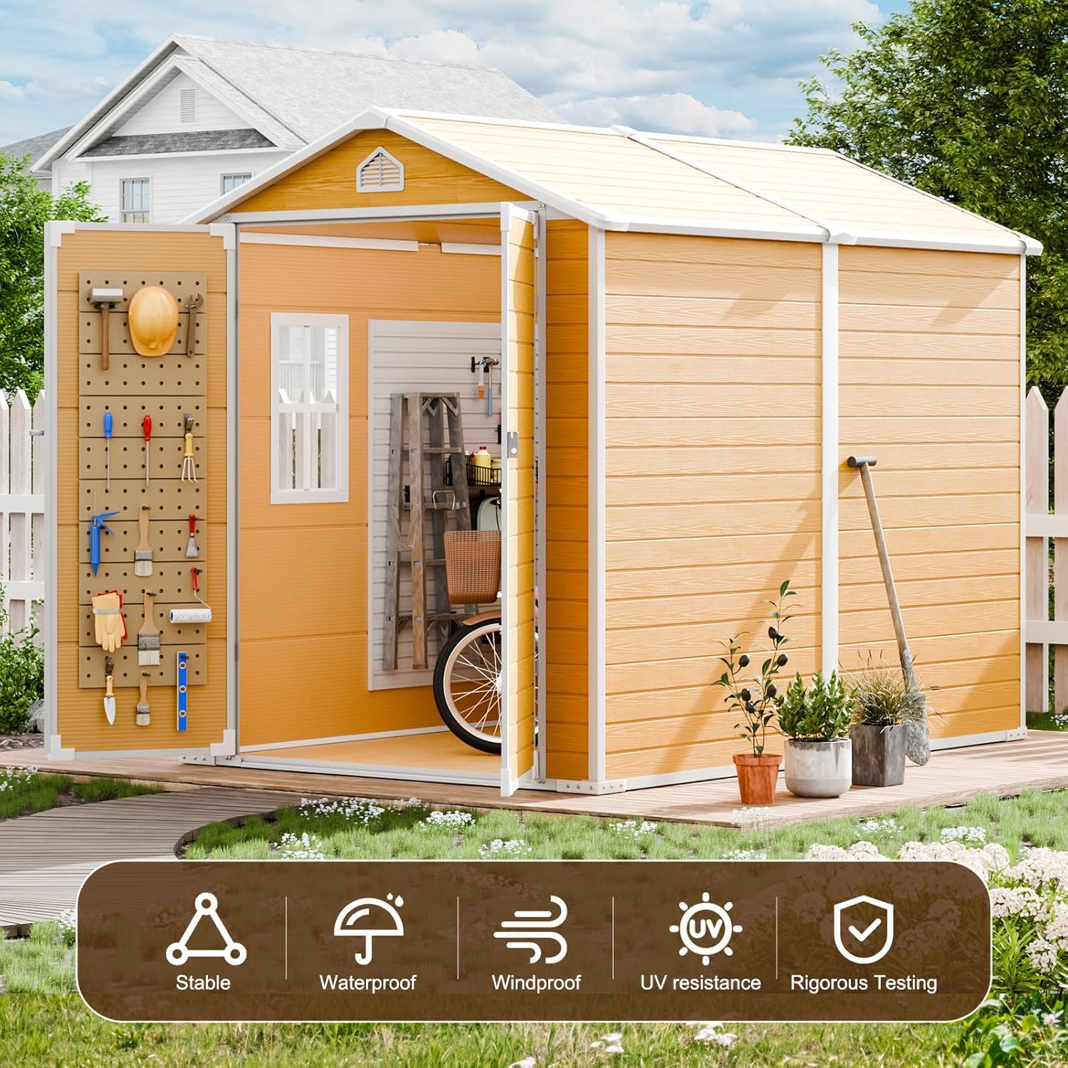 - 【PREMIUM MATERIAL STORAGE SHED WITH FLOOR】: The 14mm tough double-wall resin construction, 0.6 mm galvanized steel frame and impact-resistant floor are designed for long-term durability. The double-wall panels are waterproof and moisture-proof, allowing worry-free use in all weather conditions. It is weather-resistant, waterproof, and UV-resistant-no peeling, rotting, or rusting. The screws are embedded to ensure aesthetics and safety