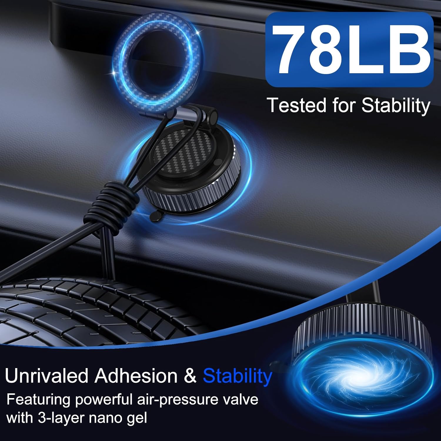 - 【360° Rotation & Dual-Axis Adjustment】 This vacuum suction magnetic phone holder features a 360° rotating base and 210° dual-axis folding metal arms, allowing easy angle adjustments to suit your needs. Whether in the car or at the office, switch between portrait and landscape modes effortlessly. Its unique folding design reduces the mount's size by 50% when not in use, keeping your space tidy. Tested over 3000 times for durability, it remains stable and reliable for long-term use
