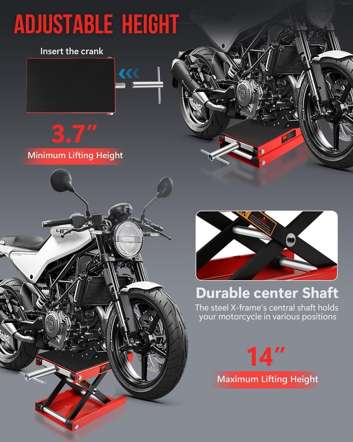 - Adjustable Height Bike Lift System : Customize your workspace with two height modes: 5.5"-15.4" (with dolly) or 3.7"-14" (without dolly). This versatile motorcycle scissor jack accommodates both low-profile and standard bikes, making it perfect for oil changes, brake adjustments, and other repair tasks as part of your motorcycle parts maintenance routine.