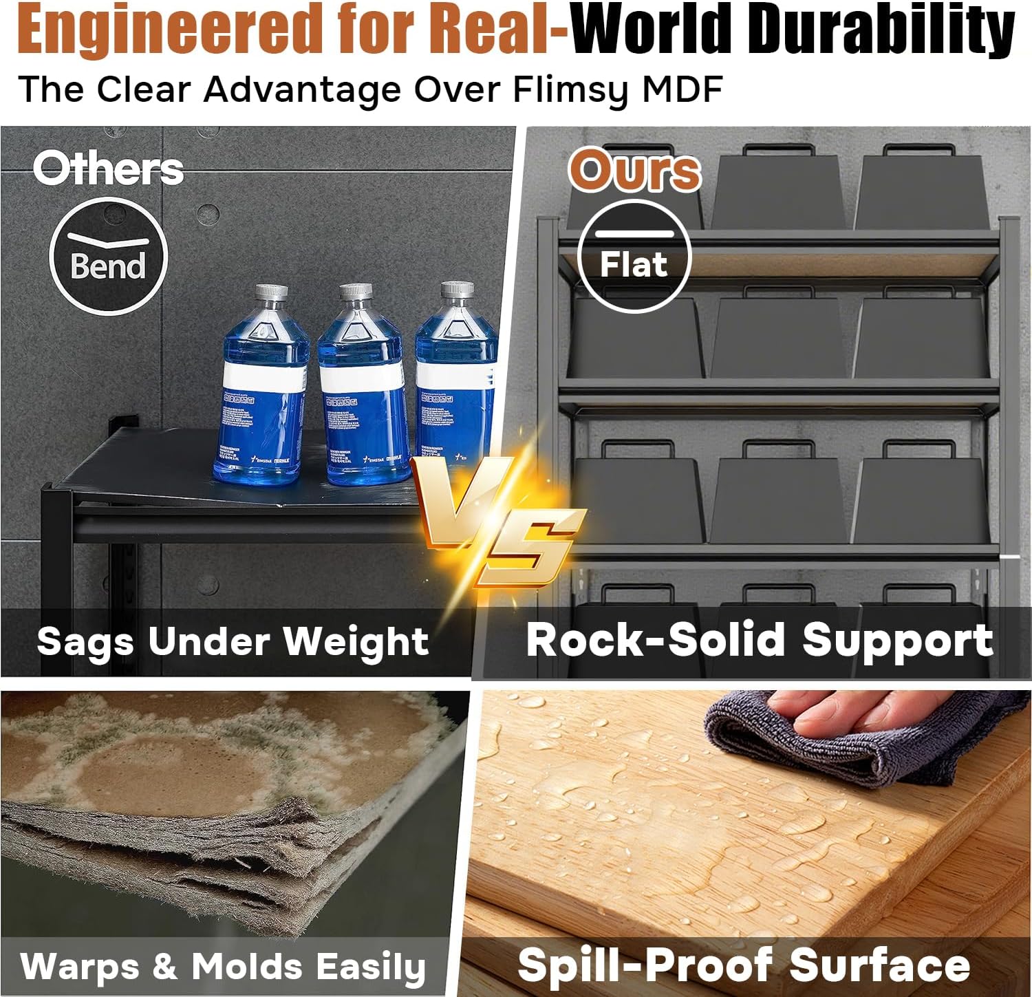 - 💪 COMMERCIAL-GRADE STRENGTH, 2500 LBS BEAST MODE – Don't settle for flimsy shelves. Our garage shelving is forged from high-quality, thickened cold-rolled steel and features an exclusive double-layered column design for unmatched stability. It effortlessly supports a massive 2500 LBS total capacity (500 LBS per shelf). From heavy power tools and packed totes to engine parts, store your heaviest items with absolute peace of mind. Conquer your clutter with confidence!