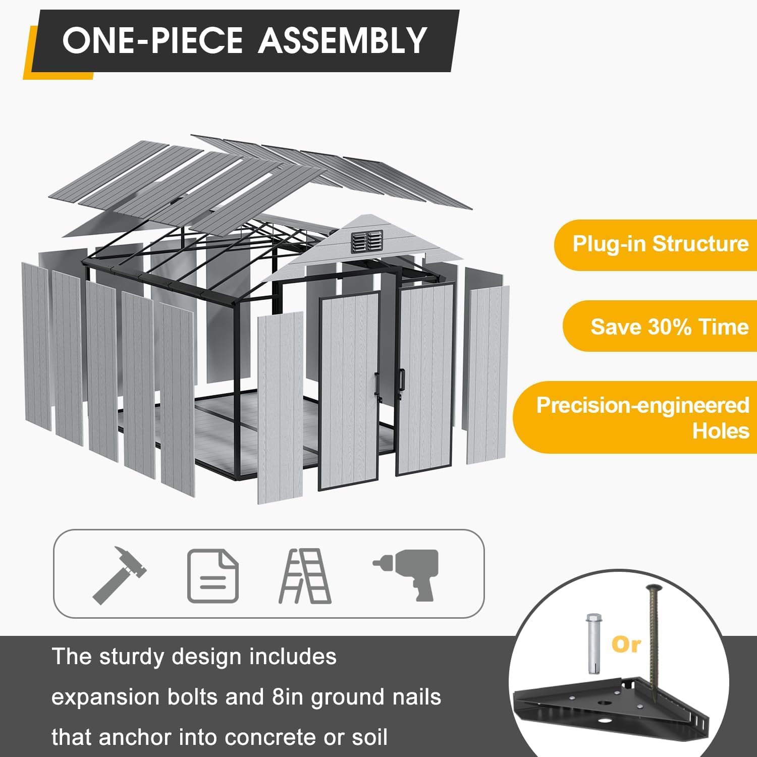 - Quick and Hassle-Free Assembly: The one-piece plug-in design simplifies installation, saving 30% time compared to other stoagre shed. If you have any questions during assembly, our responsive 24/7 customer support team is always available to assist. Please rest assured that since the manual contains the installation process of all sizes currently on sale, you only need to read part of it