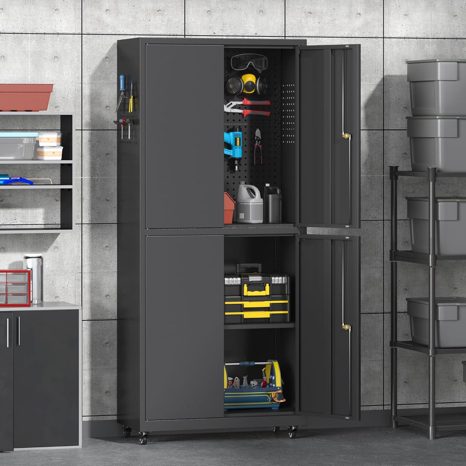 71" H Metal Tool Storage Cabinet with Lock and Wheels, Heavy Duty Garage Cabinet with 4 Doors and 2 Adjustable Shelves, Tool Organizer with Pegboard for Garage, Warehouse(Black, 71" H)