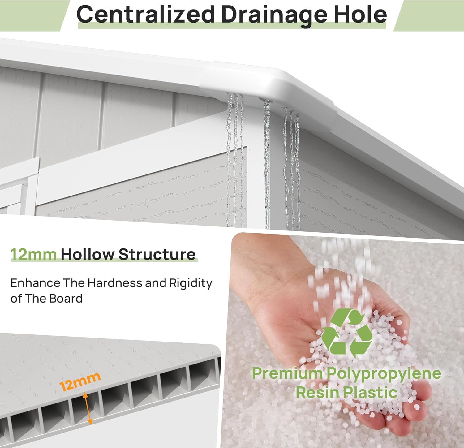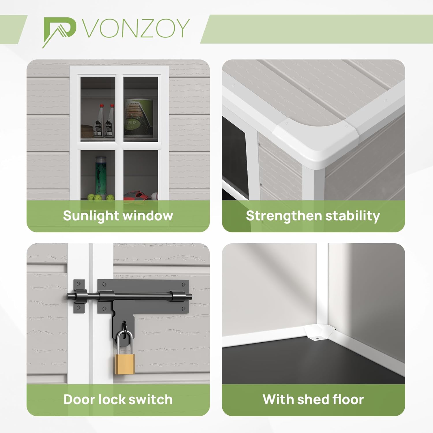 - Recyclable resin material: Compare iron and wooden, resin shed is corrosion-resistant, waterproof, rustproof and with UV protection for more than 8000 hours. Our storage shed is crafted with 12 MM hollow design polypropylene resin plastic of recyclable, less bending and puncturing, all weather conditions for customers. Also, VONZOY Promise one-year after-sale service, any problem we gottcha back in 24h.