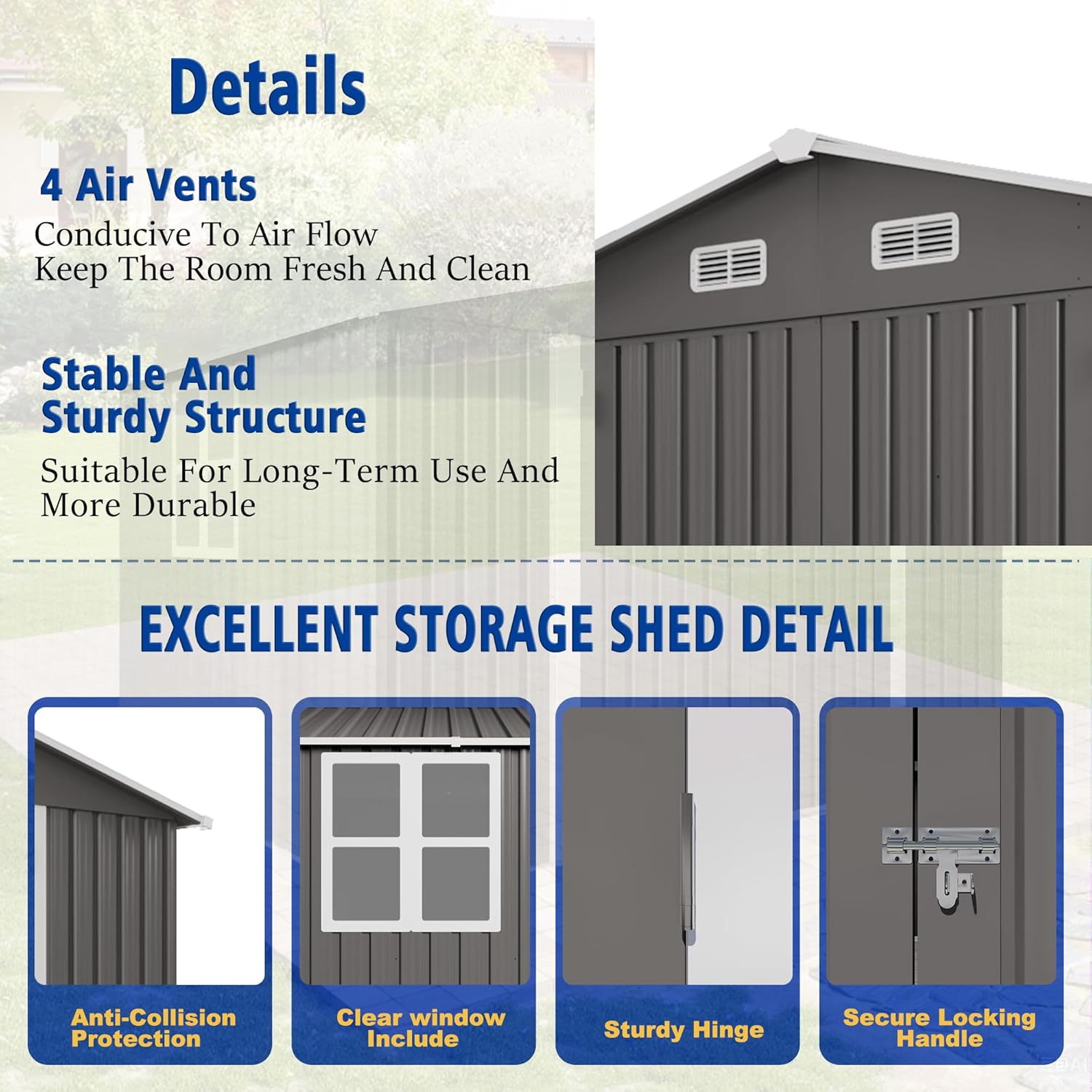 10x8 FT Outdoor Storage Shed with Window, Metal Sheds & Outdoor Storage with Lockable Door and 4 Vents, Outside Storage Shed Waterproof for Backyard, Garden, Patio, Gray